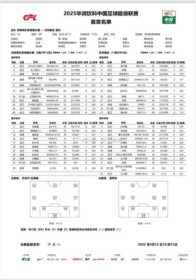 北京时间9月12日19:35,中超第24轮继续进行,河南队主场迎战北京国安,赛前双方首发阵容公布: