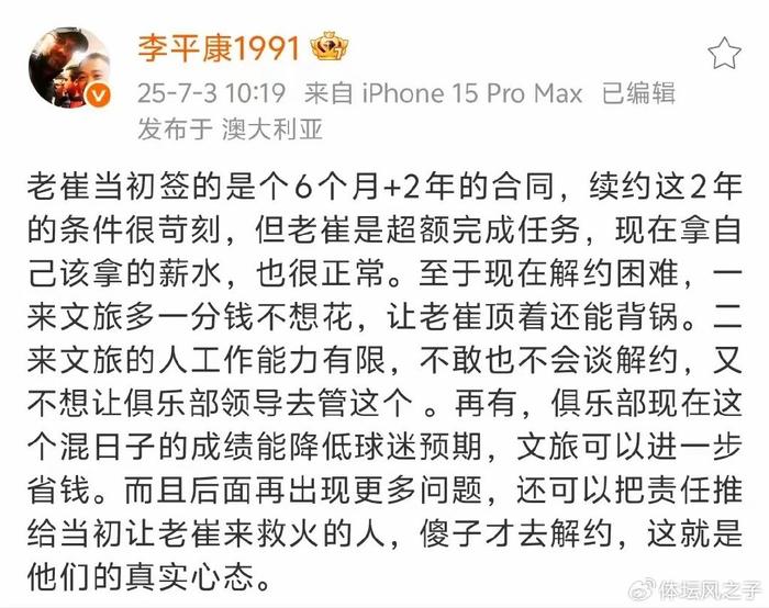 目前崔康熙与泰山队之间的矛盾无疑是受到了外界的格外关注,尤其是崔康熙在回到韩国之后,经纪公司接连炮轰泰山队,先是发文称“真理永远会战胜谎言”,随后又发文“健康被忽视、被攻击、被剥削、被迫害;休假权,是员工的权利、是符合规定的;至于真相,当真相还在穿鞋时,谎言已绕地球跑了半圈”,这些矛头无疑都是直指泰山队的。
